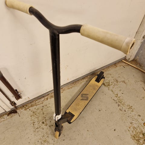 Story ride løbehjul med justerbart styr og brune håndtag. Løbehjulet har en sort ramme og to hjul, designet til nem transport og brug i bymiljøer.