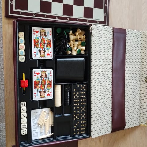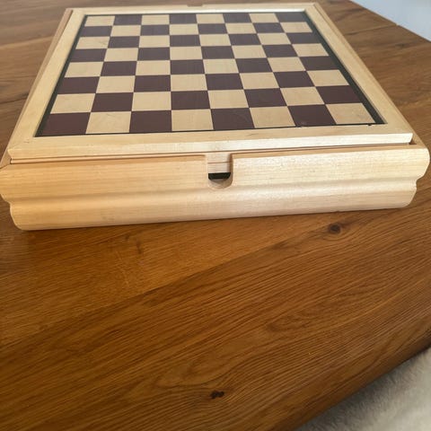 Brætspil sæt i træ med flere forskellige spil inkluderet. Sættet har en firkantet spilleplade med tern og opbevaringsrum til brikker og terninger. Egnet til brug til forskellige brætspil og familiespil.