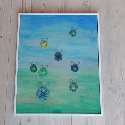 Virkelig sød akvarel af Bolette Bonfils. Motivet er et barneansigt set helt tæt på. Professionel indramning. Måler 29,5 x 24,5 cm. Hyggelig i et lille rum eller et varmt indslag på en billedvæg. Afhentes i Vanløse eller sendes.