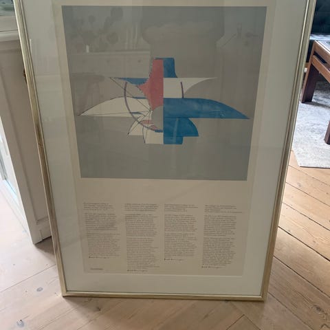 PH ph5 limited tryk I glasramme. kunsttryk med abstrakt motiv i farverne blå, hvid og rød. Printet er indrammet og indeholder tekst på tysk under billedet. Velegnet til vægophæng som dekorativ kunst.