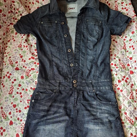 Denim jumpsuit til kvinder i størrelse S. Fremstillet i blå denimstof med knaplukning foran og elastik i taljen. Designet uden ærmer med brystlomme.