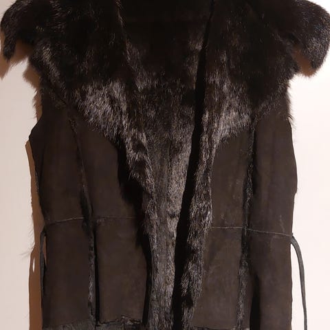 Skindet bukker nederst foran, derfor den billige pris. Skindet er i god stand ellers, skindet er lidt “stift” i det, der har den været fra ny, tænker det er måden skindet er garvet på.