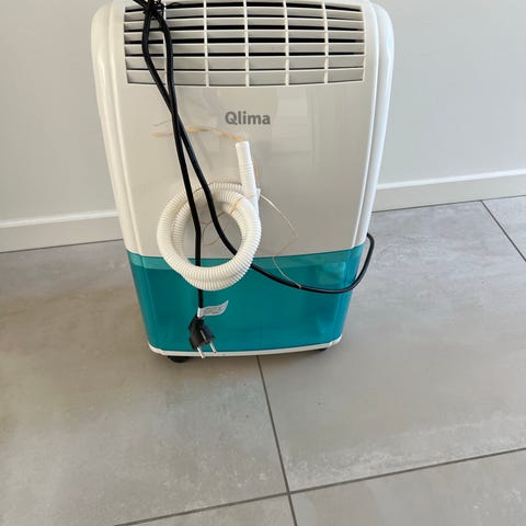 Qlima D210 affugter i hvid farve. Enheden har en kapacitet på 12 liter pr. dag og er designet til at reducere fugt i indendørs rum. Den er kompakt og mobil med hjul, hvilket gør den nem at flytte rundt. Velegnet til brug i hjem eller mindre lokaler for at forbedre luftkvaliteten.