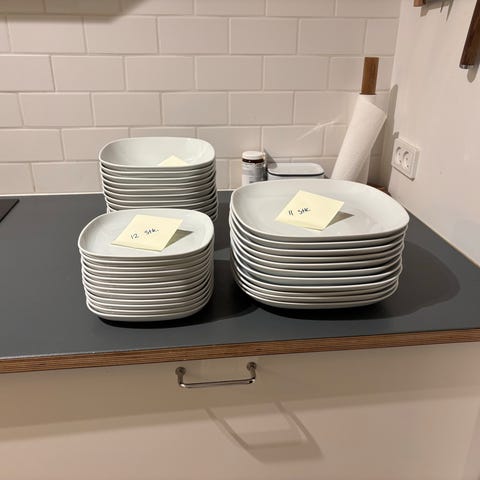 IKEA tallerkener i hvidt porcelæn i alt 34 stk. i 3 størrelser: 14,5 x 14,5, 21 x 27,5 og 31 x 25 cm.