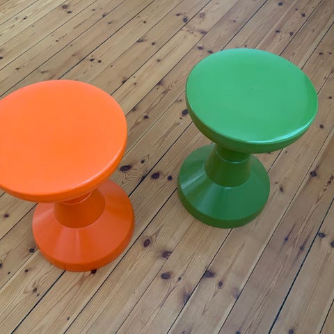 2 stk 3 benet Taburetter fra Cuba . Fine og brugbare. De kan slås sammen så de ikke fylder så meget. Samlet pris. Sender gerne.