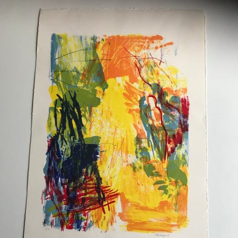 Farverigt litografi. Indeholder nuancer af gul, blå, grøn og rød med dynamiske penselstrøg. Velegnet som dekorativt element i hjem eller på kontor.