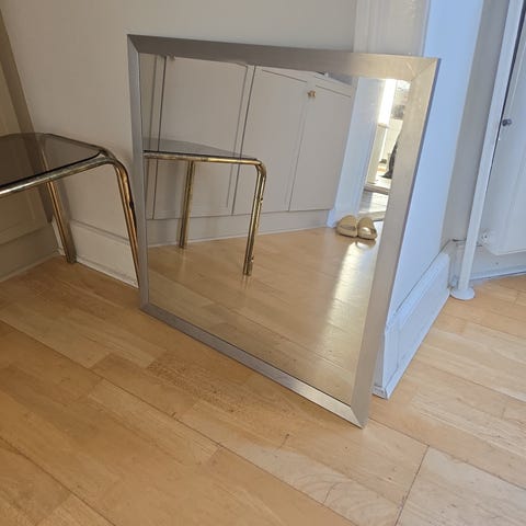 IKEA fritstående spejl med hvid metalramme. Spejlet er designet til at stå på gulvet og kan anvendes til personlig brug, eksempelvis i soveværelse eller entré. Bag spejlet findes både kroge og en stang, som gør det nemt at hænge tøj, jakker, tasker og andet.