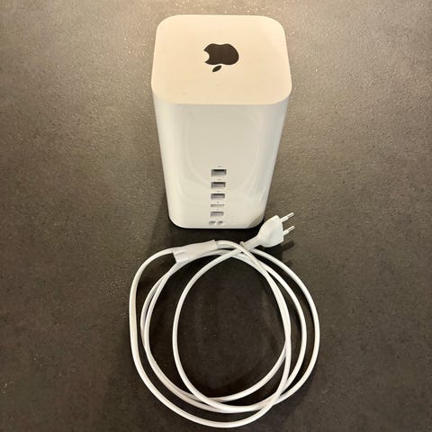 Apple AirPort Extreme router i hvid farve. Enhed med flere Ethernet-porte til netværksforbindelse. Designet til trådløs netværksdeling og internetadgang i hjemmet eller kontoret.