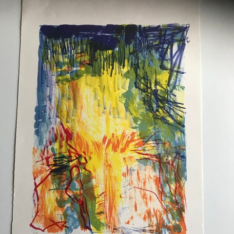 Farverigt litografi. Indeholder en blanding af farver som gul, orange, grøn, blå og rød i et ekspressivt og farverigt design.
