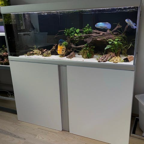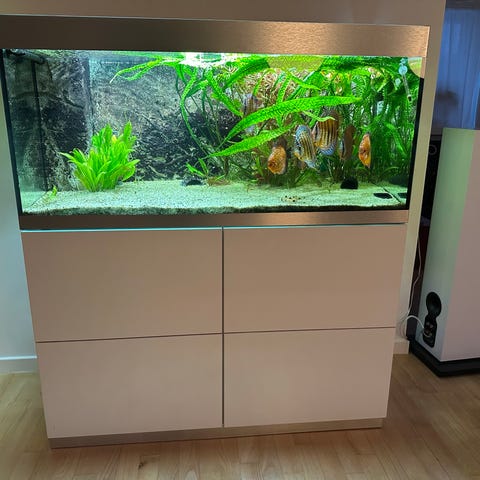 Akvarium med hvidt skab og LED-belysning. Akvariet har buet glas . Indhold følger ikke med . Kun akvarie med lampe og underskov som er til salg samt en spandpumpe der med følger .