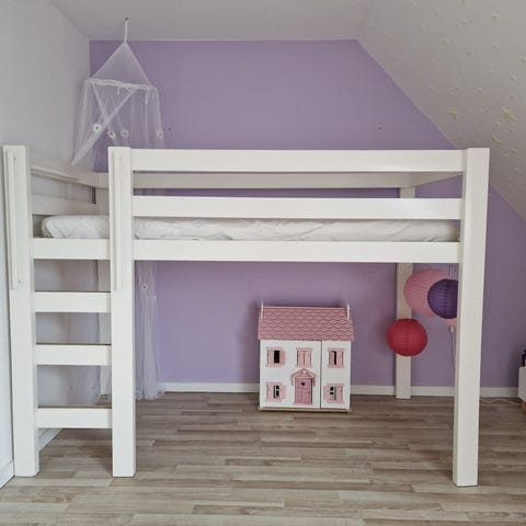 Høj/halvhøj seng i hvid med rosafarvede gardiner.
