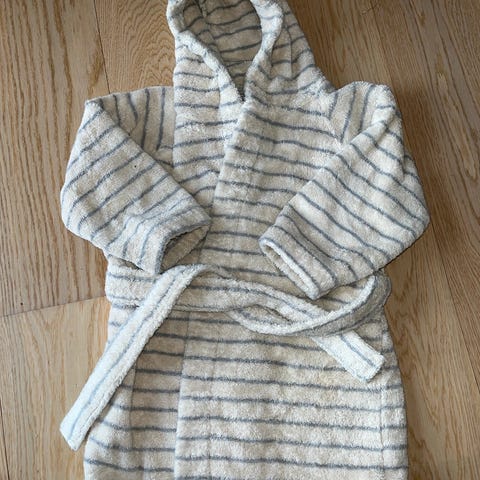 Konges Sløjd Junior Badekåbe i 100% bomuld. Str. er ikke markeret på kåben, men svarer til ca. 4-7 år. (længde 60 cm - ærmelængde 43cm). Der er en lille misfarvning forrest på badekåben - formentlig en fejl fra fabrikken eftersom den har samme farve som striberne. Ellers er den så god som ny. 😉