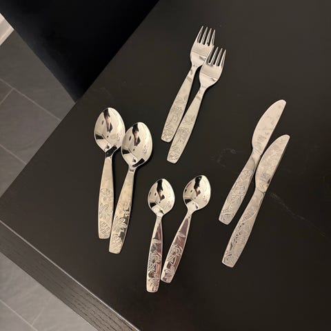 Edelstahl 18/10 . Rustfri bestik. Vores børnebørn vokset fra det. Brugt kun få gange. Kan barnet starte med dem fra havvandet år.