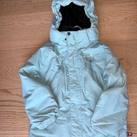Jakken er som den skal være, men der forekommer lidt misfarvninger på fronten ved lynlåsen og en misfarvning på højre ærme. Se billeder. Jakken er af den type, der kan udvides på ærmerne og den er blevet udvidet. Hvorfor den er nærmere str. 104 end 98.