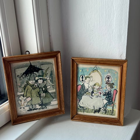 dekoration/ornament. To kunstværker med tegninger og tekst, indrammet i trærammer. Passer til vægophæng eller som dekorative elementer i hjemmet eller kontoret.