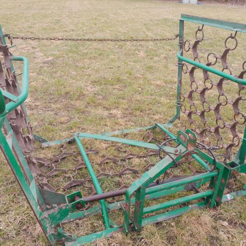 Kongskilde markharve til jordbearbejdning. Maskinen er udført i metal med rød lakering og har flere rækker af tænder til effektiv bearbejdning af jorden. Udstyret med hjul til nem transport og justerbar ramme til tilpasning af arbejdsbredde.
