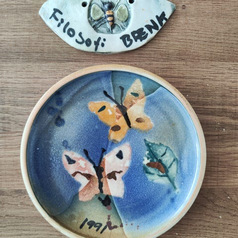 WMF dekorationsplader med motiv af to fugle på en gren og en svane i vand. Pladerne er lavet i keramik og har detaljeret reliefdesign med grønne og blå farver. Velegnet til vægophæng som dekorative elementer.