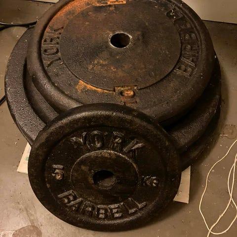 Ca. 50 kg i alt med vægtskiver, stang og spændemøtrikker.