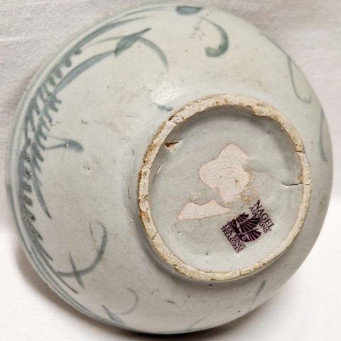 En smuk stor Swatow-skål i famille verte-farver fra det 17. århundrede, Ming-dynastiet. Den tykke glasur er dekoreret med livlige, klare farver. I midten er der en smuk kraniel, og langs kanten er der medaljoner med blomster og bær samt rutemønstre. På undersiden er der meget fastgjort sand, hvilket er karakteristisk for denne periode, fordi den brændte keramik blev sat i sandet for at køle af.