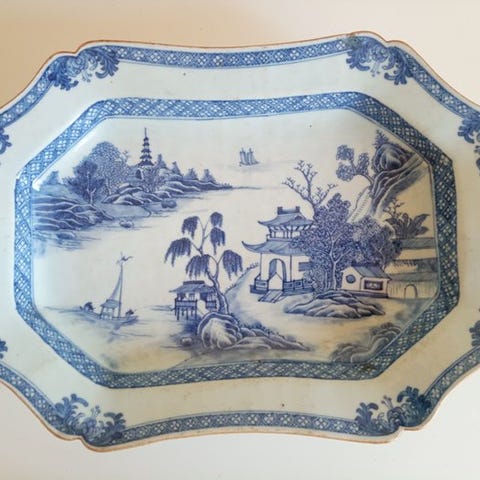 Et flot blåt og hvidt fad fra tidligere Kangxi-periode, dekoreret med en central scene af to Feng Huang-folk, der flyver over en siddende udødelig, der holder en lotusknop, og hans ledsager nær en klippefyldt kyst.