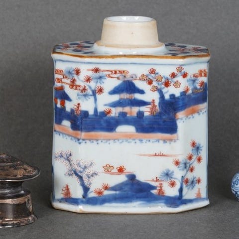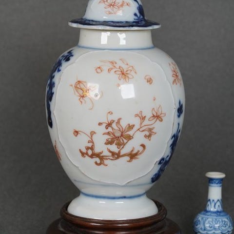 Porcelæns temelonformet tekrug fra Kangxi-perioden (ca. 1700), Jingdezhen-kilnerne, Jiangxi, Kina, dekoreret med Eight Moths Amidst Peonies and Chrysanthemum i kobberrød og guld over blå-hvid baggrund, med original låg (restaureret knop) og i god stand med et hårspidsfraktur. Klik på den blå "gå til varen" knap, for at købe eller byde på denne vare. Den samlede pris vil blive vist inden du afgiver dit bud.