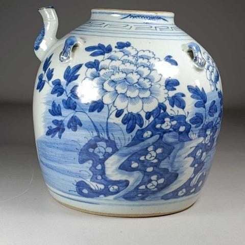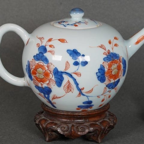 En smuk antik sjælden kinesisk porcelænsteglaseret tekande i form af en melon med centralt dekoration af otte sommerfugle blandt peoner og krysantemum, udført i en fin underglasblå og hvid med overglasjernrød og guld. I kanten en klassisk dekoration af blomster- og dobbeltcirkelmønstre. En elegant formet øre og en robust skud med blomster. Håndlavet i det gamle kejserlige Kina under Qing-dynastiet, Kangxi-perioden (ca. 1700). Garanti for originalitet og ægthed i den angivne periode.
