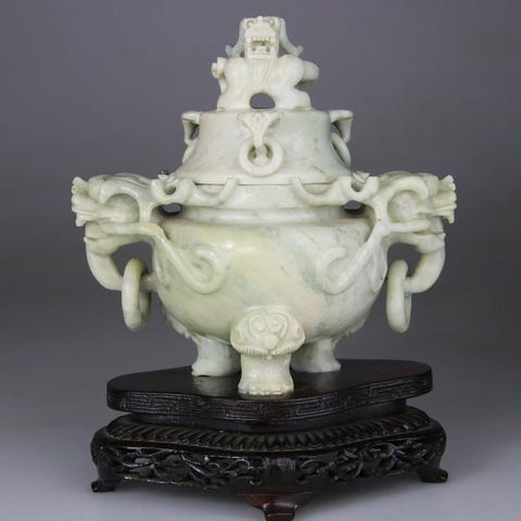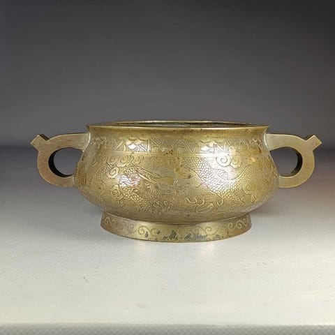 Bronze brûle parfum med låg fra det 20. århundrede, brun patina og kobber- og sølvindlæg, der viser figurer og ryttere; håndtagene og låses knappen er chimærelignende, målene er 16 × 19 cm. Klik på den blå "gå til varen" knap, for at købe eller byde på denne vare. Den samlede pris vil blive vist inden du afgiver dit bud.