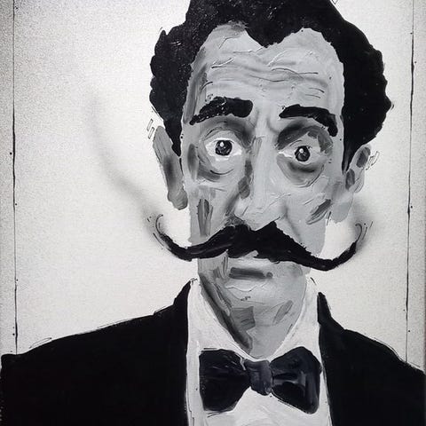 Kompositionen skiller sig ud med en rytmisk baggrund af farvede vandrette bånd, der kontrasterer med et bredt mørkt område, som fremhæver silhuetten og forstærker den visuelle spænding. De livlige farver på figuren — grøn, blå og rød — styrker værkets energi og minder om koderne i samtids street art.