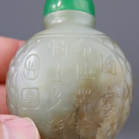 Qing-dynastiet tabatier af jade nephrite celadon med bronzehætte og rødt koral cabochon, under navnet “Superbe Tabatiere Sculpture Grue - Marque”. Klik på den blå "gå til varen" knap, for at købe eller byde på denne vare. Den samlede pris vil blive vist inden du afgiver dit bud.