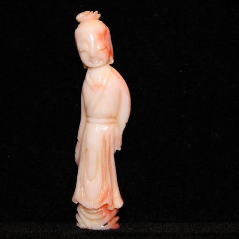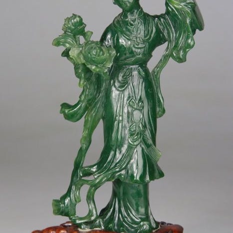 Meget smuk skulptur i karneol, finhakket udskåret og med en smuk polering, Kwanyin bærer en kurv med frugt.