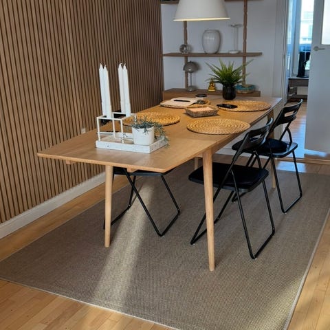 MELLANSEL spisebord af egetræsfiner med udtræk. Der medfølger to tillægsplader, som er hvide og ligner marmor-look. Kostede 5700 kr. Fra ny i Ikea. Kan ikke leveres, køber skal selv afhente.