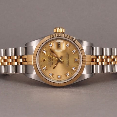Rolex Datejust 178343, tofarvet automatisk damemodel med kasse på 31 mm i guld/stål, champagne farvet blomster-arabisk urskive, armbånd af guld/stål, 180–200 mm, fremstillet i 2010, med originalboks og papirer. Klik på den blå "gå til varen" knap, for at købe eller byde på denne vare. Den samlede pris vil blive vist inden du afgiver dit bud.