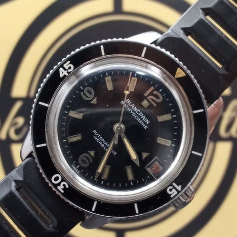 Blancpain Fifty Fathoms med automatisk urværk, fra 1950’erne, stål 40 mm kasse, sort original urskive, plexiglas og ikke-originalt textilrem, generelt i god stand med synlige brugsspor. Klik på den blå "gå til varen" knap, for at købe eller byde på denne vare. Den samlede pris vil blive vist inden du afgiver dit bud.