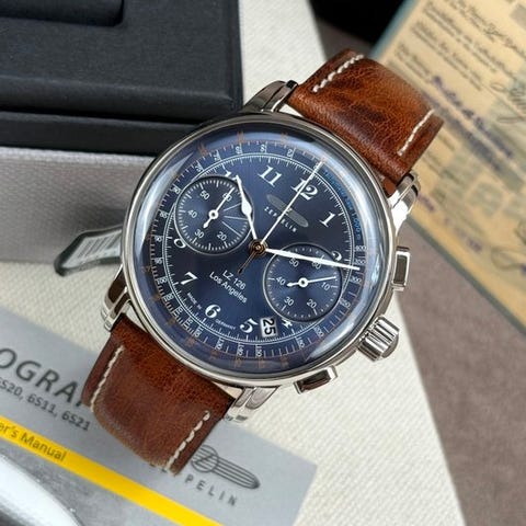 Zeppelin Los Angeles reference 8644-3, Quartz-armbåndsur med 43 mm stål kakse, blå skærm, dual time zone ved kl. 6 og dato ved kl. 12, ny, med originalboks og papirer og garanti, stålrem, samlet længde ca. 21 cm, periode 2020+, forsendelse forsikret. Klik på den blå "gå til varen" knap, for at købe eller byde på denne vare. Den samlede pris vil blive vist inden du afgiver dit bud.