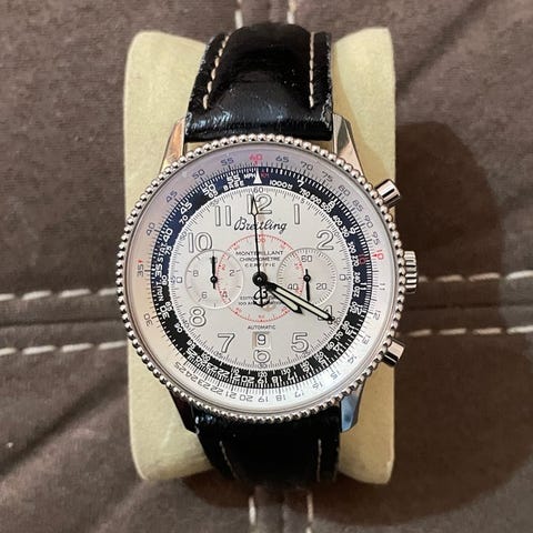 Breitling Montbrillant Spatiographeautomatisk herreur i stål, kasse 41 mm, sølvhvidt urskive, læderrem, vandtæt til 100 m, chronograf, 10-minutters timer, time, minutter og sekunder; reference A36030.1 0375, periode 2000–2010, automatisk urværk, stand: meget god med let slid på bagsiden. Klik på den blå "gå til varen" knap, for at købe eller byde på denne vare. Den samlede pris vil blive vist inden du afgiver dit bud.