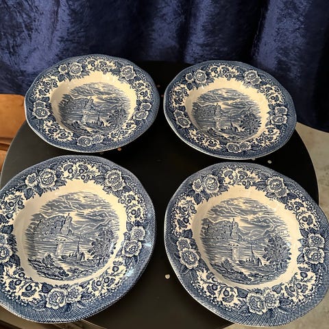 Seks keramiske tallerkener fra Enoch Wedgwood (Tunstall) Ltd, model Asiatic Pheasants, i antik stil med blomsterdekoration, fremstillet i Storbritannien, ca. 28 cm brede, i god brugt stand med mindre alderssigner, dateret 1980–1990. Klik på den blå "gå til varen" knap, for at købe eller byde på denne vare. Den samlede pris vil blive vist inden du afgiver dit bud.