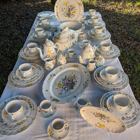 Inkluderer fuld service til 9 tjenester med deres kopper og tallerkener.