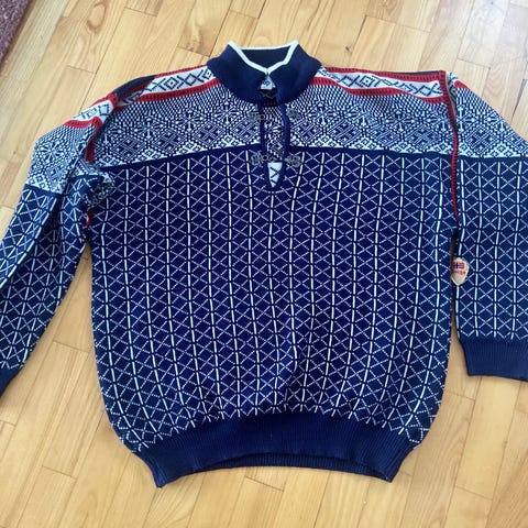Varm sweater i størrelse L. Strikket i 100% ren ny uld fra Donegal, Irland. Sweateren er råhvid og har et klassisk mønster med struktur. Den har følgende mål: