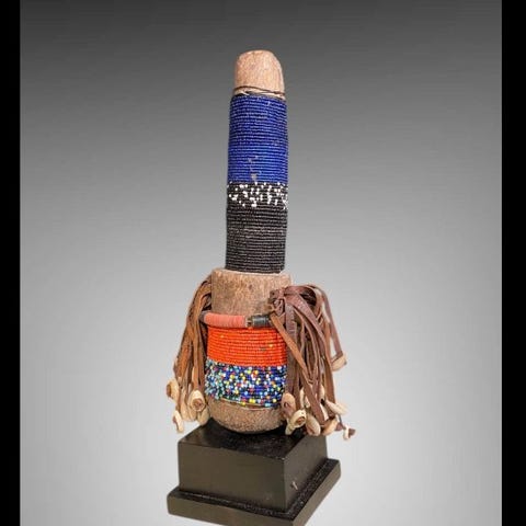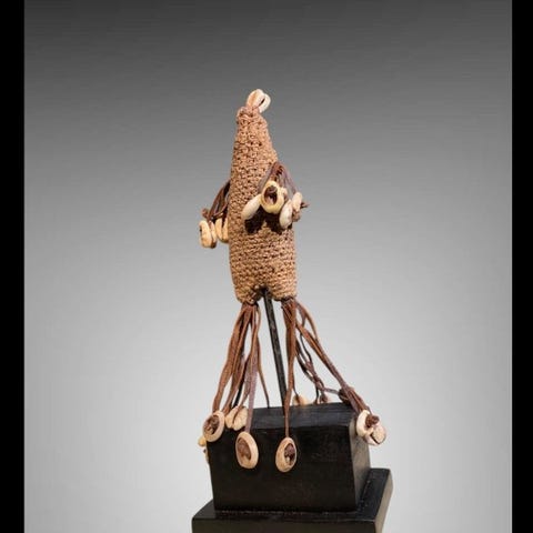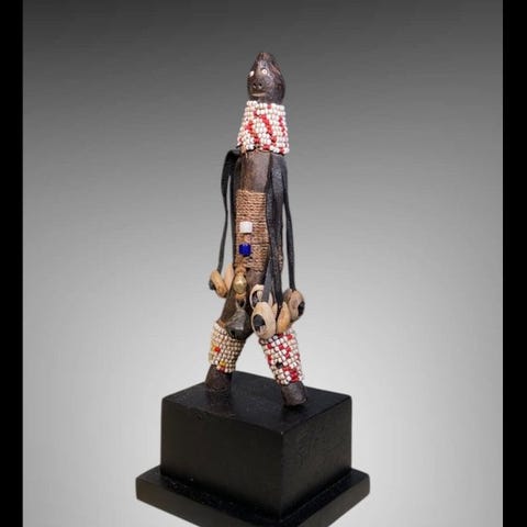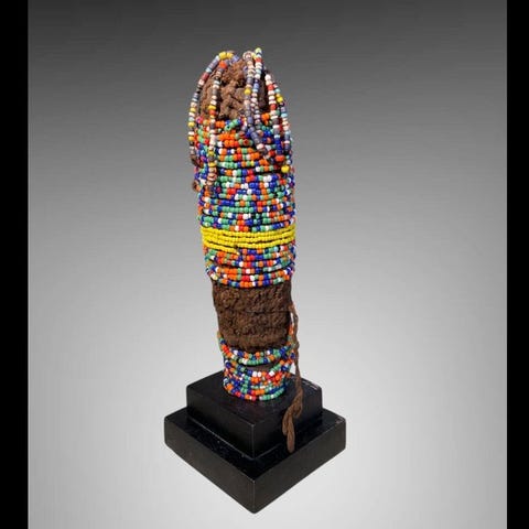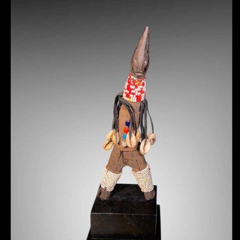 Statuetter - 17 cm, Namji/Fali fra Kamerun, Oprindelse Privatsamling, 1 enhed, materialer stof, reb, læder og perler, dimensioner 17 × 5 × 7 cm, vægt 300 g, tilstand Fremragende, leveres med stand, dateret til anden halvdel af det 20. århundrede. Klik på den blå "gå til varen" knap, for at købe eller byde på denne vare. Den samlede pris vil blive vist inden du afgiver dit bud.