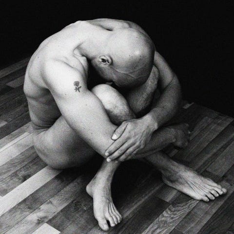 Dette udtryksfulde foto viser et iscenesat kropslandskab mellem maskerade og forførelse.