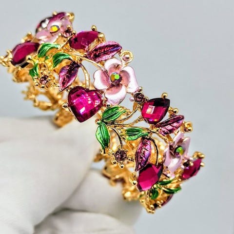 Joan Rivers Classics Collection guldfarvet blomsterarmbånd med enamel i flere farver og østerrikske crystals; ny, til kvinder, størrelse 7¼ tommer, bredde 25 mm, vægt 56,52 g, med gaveæske og velourpose. Klik på den blå "gå til varen" knap, for at købe eller byde på denne vare. Den samlede pris vil blive vist inden du afgiver dit bud.