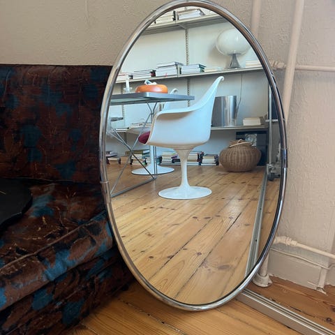 Ovalt spejl med venetiansk æstetik med en ram dannet af koncentriske bånd af indlagt krystaller, afsluttet med små blomstermotiver i en guldfarvet finish. Den visuelle rigdom og den dekorative lethed i hele sættet henviser direkte til det ornamentale sprog i det 20. århundrede, uden at specificere en bestemt æra. Den ovale form tilføjer blødhed og vertikalitet, mens spillet mellem glans, refleksioner og guld indfører lysstyrke og skulpturel tilstedeværelse i rummet.