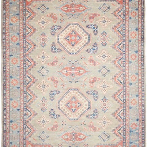 Håndlavet Kazak-tæppe, fremstillet i Pakistan, måler 297 x 201 cm, farverne grå, blå, rød og beige, vægt 17 kg, i meget god stand og professionelt renset. Klik på den blå "gå til varen" knap, for at købe eller byde på denne vare. Den samlede pris vil blive vist inden du afgiver dit bud.
