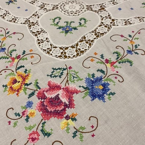 Dette dugværk er et luksusstykke, unikt og uforligneligt, et kunstværk på bordene, der går i arv fra generation til generation. Det består af et rent linneddug håndsyet med tråde i bløde farver og 24 servietter i to størrelser, til servering af frokoster og eftermiddagskaffe eller te.