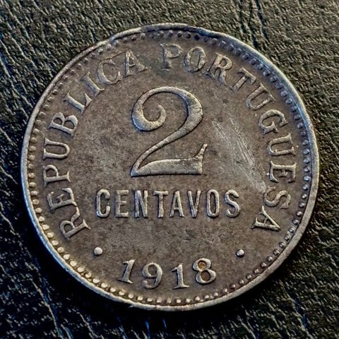 Forside: Portugals kronede våbenskjold, årstal, pålydende værdi, 3 blomster med 4 kronblade med herskerens navn og titel omkring.