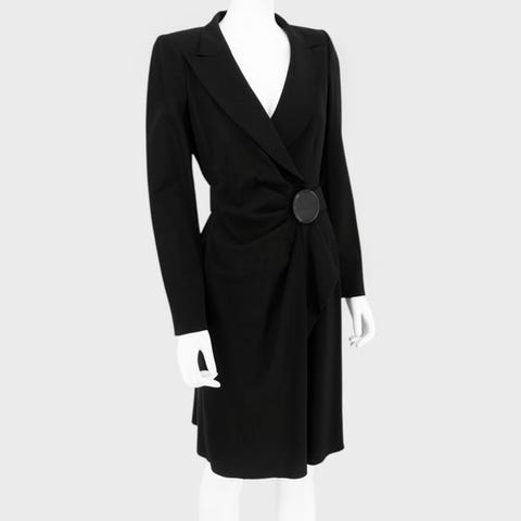 Draperet model med talje fremhævet af bælte og asymmetrisk kort nederdel.