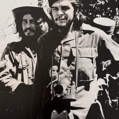 På billedet kan man tydeligt se kommandør Ernesto “Che” Guevara, med sin karakteristiske sorte hat prydet med det ensomme revolutionære stjerne, et symbol der med tiden blev universelt. Che ses med armen i slynge, en følge af de sår, han pådrog sig i kampene, omgivet af sine guerrillakompanjoner efter sejren over diktator Fulgencio Batistas styrker.