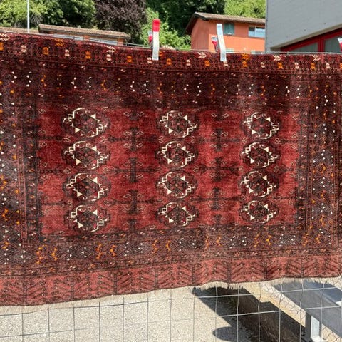Turkmensk Yomut Chuval fra Turkmenistan, håndvævet uld-på-uld tæppe, 124 × 80 cm, begyndelsen af det 20. århundrede, i god stand med tegn på aldring og slitage, professionelt rengjort. Klik på den blå "gå til varen" knap, for at købe eller byde på denne vare. Den samlede pris vil blive vist inden du afgiver dit bud.