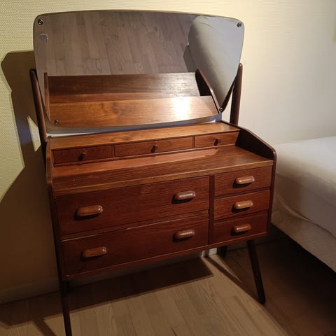 Denne kommode med justerbart spejl er et smukt eksempel på dansk design fra 1960'erne. Lavet af teaktræ, der kendetegner dette populære træ materiale. Med to store skuffer og tre mindre skuffer tilbyder den rigelig opbevaringsplads til tøj, smykker og andre personlige ejendele.