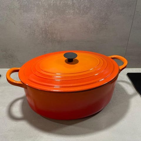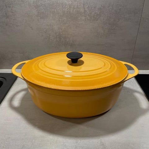 Stor cocotte højt og dækket i emaljeret støbejern, udgivet af Le Creuset, ikonisk model La Mama, designet af Enzo Mari.